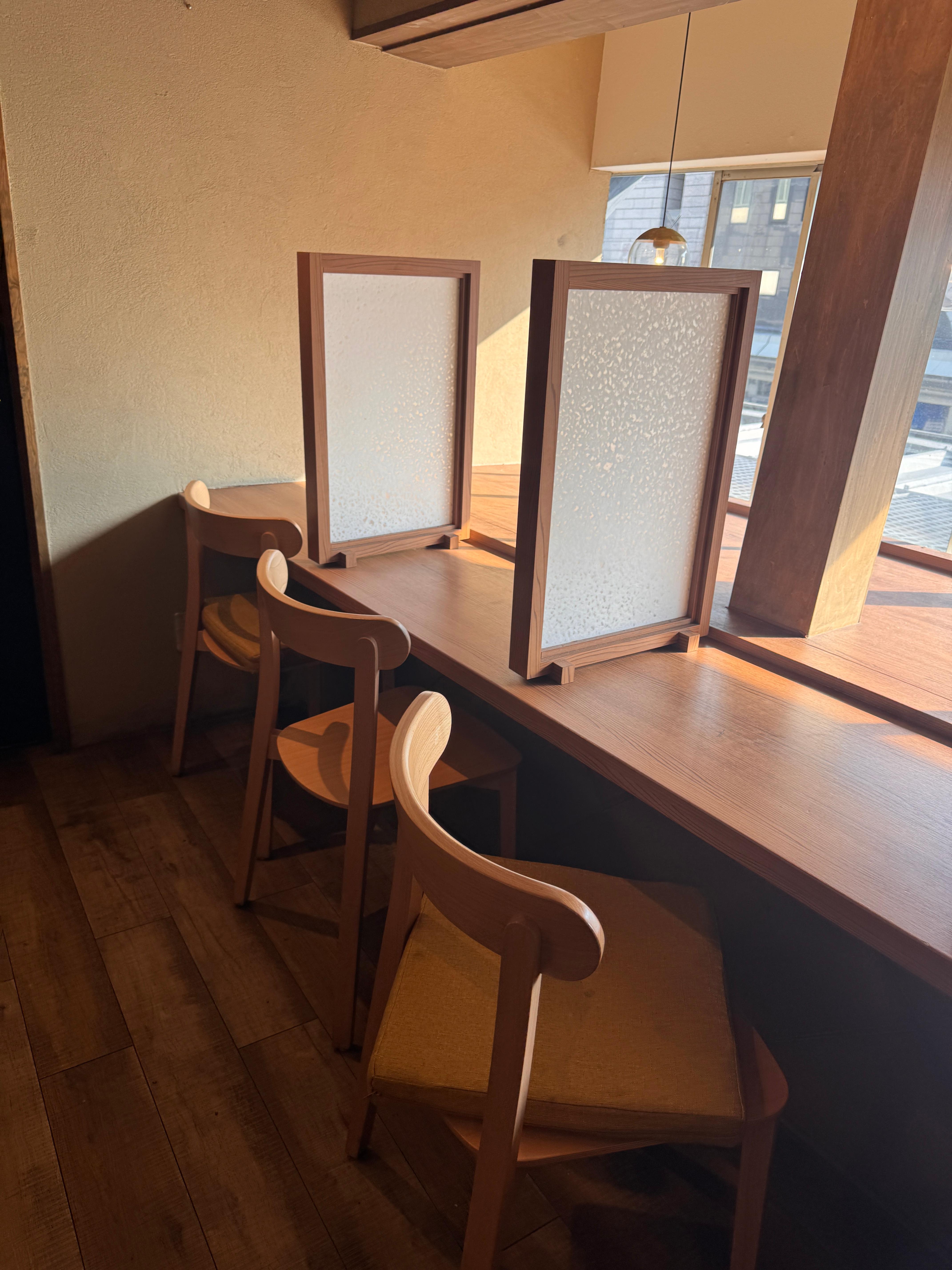 2층으로 올라가면 1층의 활기찬 분위기와는 상반된 차분하고 아늑한 공간이 펼쳐집니다. 따뜻한 우드 톤의 테이블과 은은한 조명은 여행 중 쌓인 피로를 잠시나마 녹여주기에 충분합니다. 창가 좌석은 교토의 골목 풍경을 감상하며 식사하기에 최적의 장소입니다. 또한, 매장 한편에는 셀프 식수대와 퇴식구가 깔끔하게 마련되어 있어 편리하게 이용할 수 있습니다.
