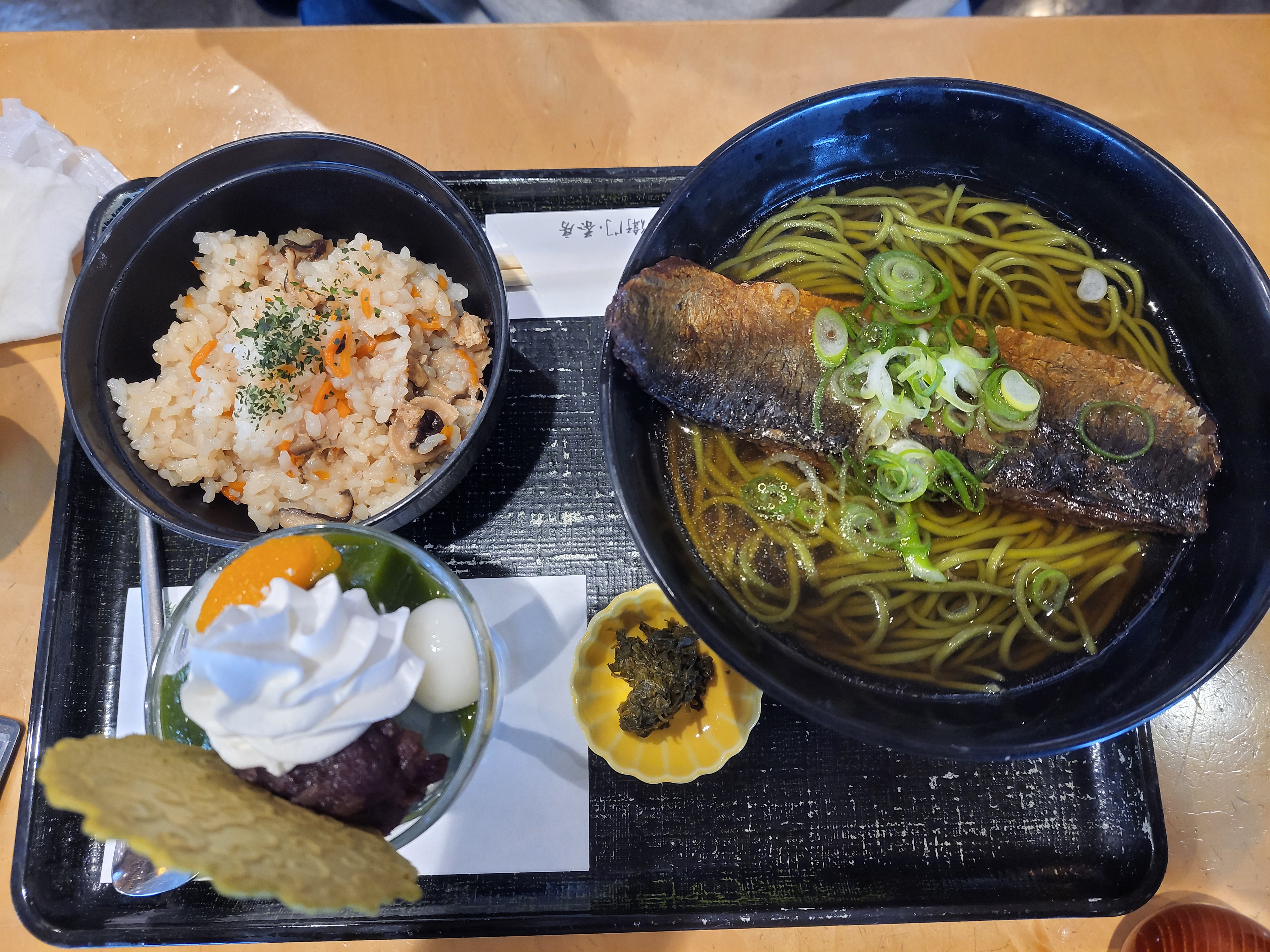 가장 인기 있는 메뉴는 교토의 전통을 담은 니신(청어) 소바와 쇠고기 쿠죠네기 말차 소바입니다. 니신 소바는 달콤 짭짤하게 조린 청어 한 마리가 통째로 올라가는데, 자칫 비릴 수 있다는 선입견과 달리 깊고 담백한 국물 맛을 자랑합니다. 반면 쇠고기 쿠죠네기 소바는 교토 특산품인 쿠죠 파의 아삭함과 부드러운 쇠고기가 말차 면과 환상적인 조화를 이룹니다. 가격대는 단품 기준 약 1,200엔에서 1,400엔 사이이며, 카야쿠 밥(일본식 솥밥)과 미니 파르페가 포함된 세트 메뉴는 1,900엔 내외로 구성되어 있어 한 끼 식사로 충분한 만족감을 줍니다. 니신 소바를 먹어보았는데, 생각보다 너무 맛있어서 놀랐습니다. 비릴 줄 알고 걱정을 했는데, 오히려 굉장히 단맛이 났습니다. 한번 경험상 드셔보시는 것도 괜찮을 것 같습니다.