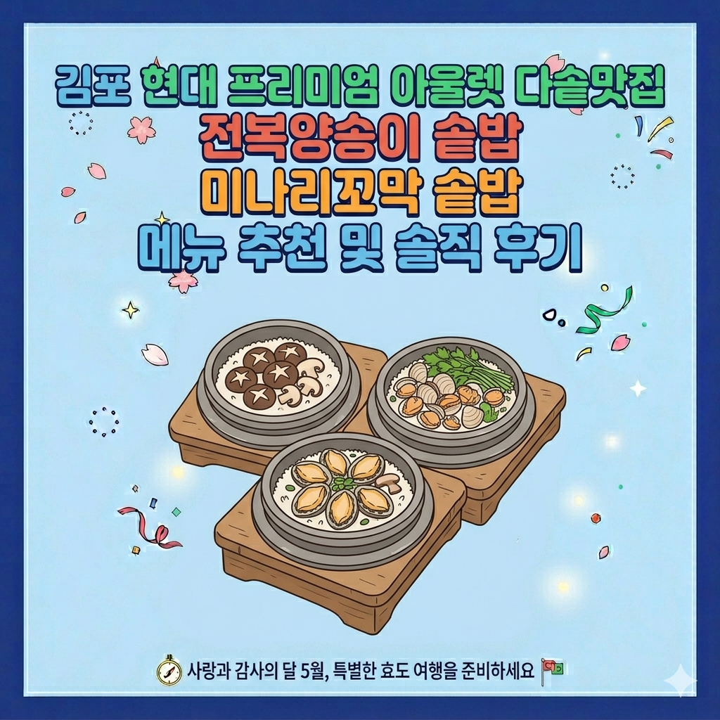 안녕하세요! 오늘은 주말 나들이나 쇼핑 코스로 인기가 높은 김포 현대 프리미엄 아울렛(일명 김현아)에서 찾은 보석 같은 맛집, 다솥맛집을 소개해 드리려고 합니다. 아울렛에 가면 보통 푸드코트의 자극적인 음식이나 패스트푸드를 떠올리기 마련인데요. 쇼핑으로 지친 몸에 활력을 불어넣어 줄 따뜻한 솥밥 한 그릇이 간절할 때가 있죠. 특히 부모님을 모시고 가거나 아이와 함께 건강한 식사를 하고 싶을 때 이곳은 최고의 선택지가 됩니다. 제가 직접 먹어본 전복양송이 솥밥과 이번에 새롭게 출시된 미나리꼬막 솥밥의 솔직한 맛 평가부터 이용 꿀팁까지 지금부터 상세히 알려드릴게요. 이 글을 끝까지 읽으시면 실패 없는 김포 아울렛 맛집 탐방이 되실 겁니다.